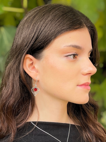A leveles fülbevalót természeti forma ihlette, magában foglalja az organikus motívumszerkesztés jellegzetességeit is. Alakja enyhén homorú. A levélerezetre emlékeztető formát piros szinű jade ásvány díszíti, ami a színe miatt kedvelt kő. A fülbevaló választható más ásvánnyal is.