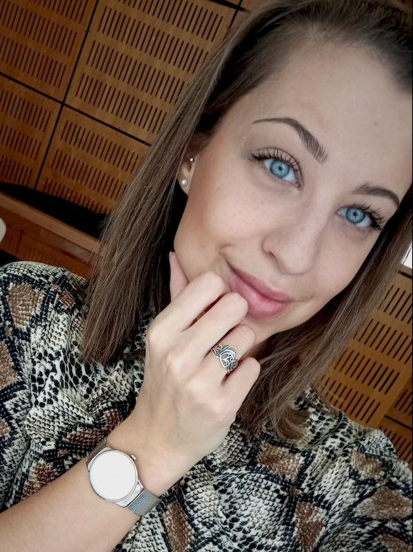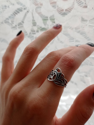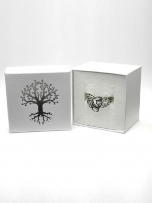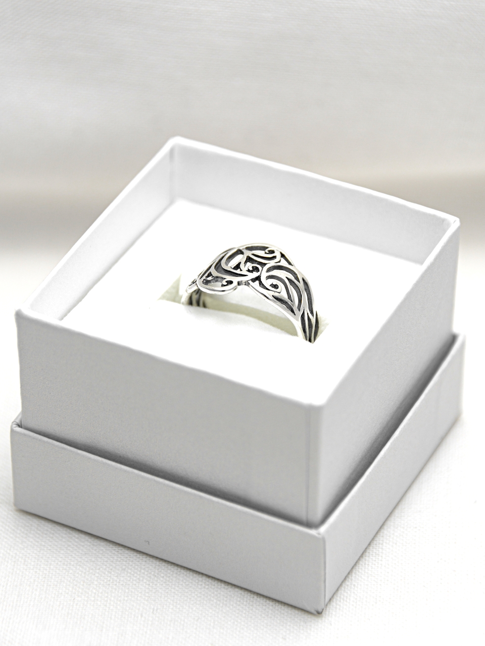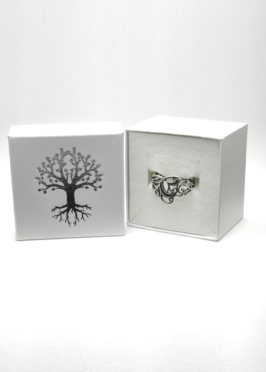 Az indás gyűrűt természeti forma ihlette, de magában foglalja a szerves műveltség motívumszerkesztési jellegzetességeit. A tárgy felületi plasztikáját antikolással tettük karakteresebbé. A díszítmény felszíne a kiemelkedő részeken fényes, ezüstfehér, a mélyedésekben sötétszürke.