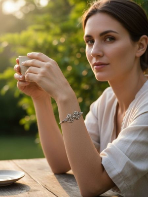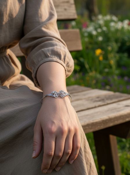 A karkötő lágyan kanyargó formái az indák játékos mozgását idézik, amelyek mintha egy táncban fonódnának össze. Ez a szimmetrikus, mégis élettel teli dizájn nemcsak látványos kiegészítő, hanem szimbolikus jelentéssel is bír: az élet folytonosságát, a kapcsolatok erejét és a természetes szépség örök körforgását jeleníti meg.
