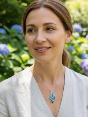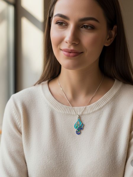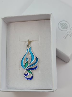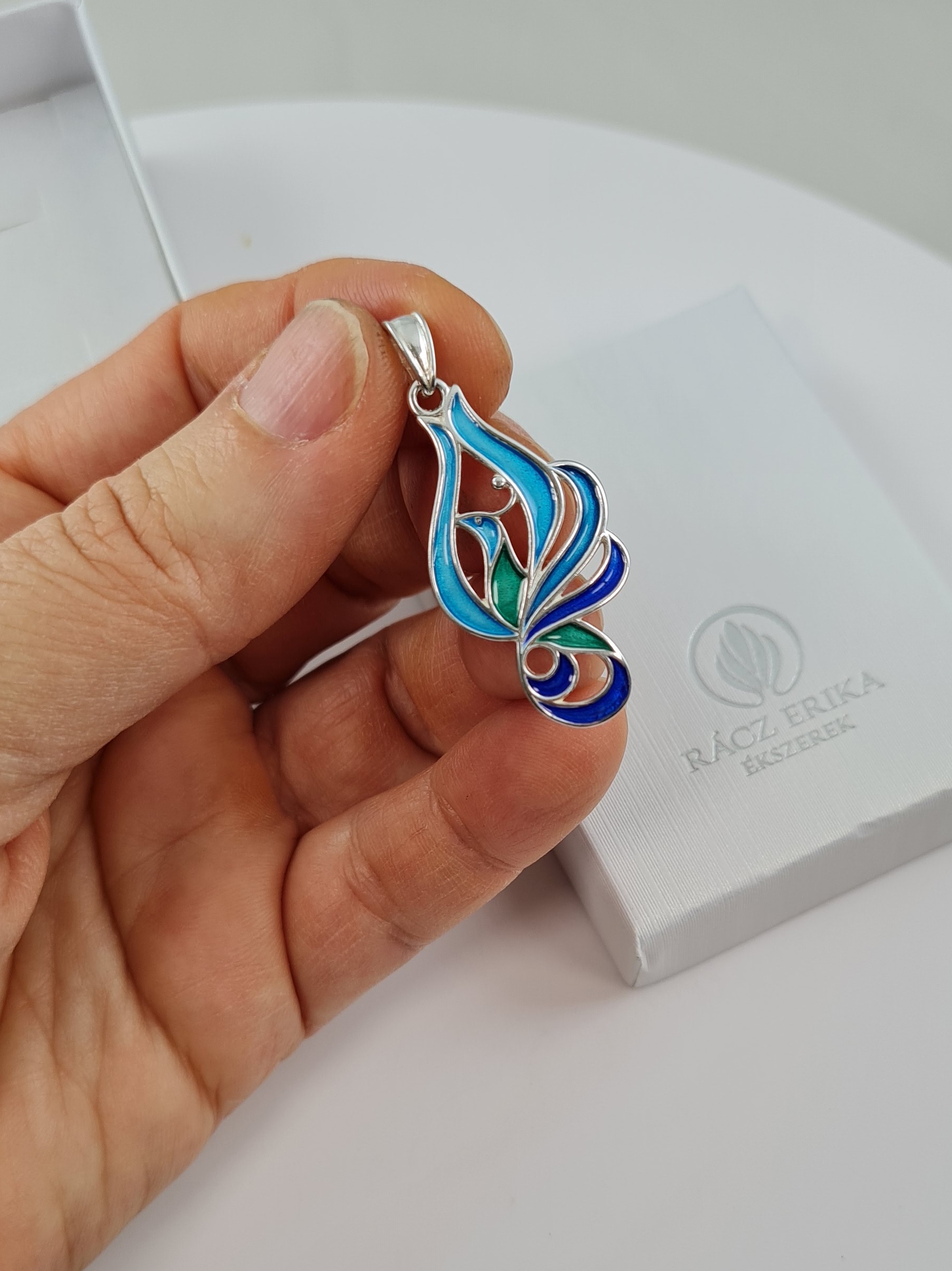 Ez az egyedi ékszer a kézműves tűzzománc technika mesterműve: a medál mintája finoman kidolgozott, színeiben dominál a mélykék, türkiz és ezüst árnyalatok harmóniája, melyek a főnix tündöklését és tüzét idézik meg. A zománcréteg alatt ragyogó 925-ös finomságú sterling ezüst keret elegánsan öleli körül a motívumot, kiemelve annak minden apró részletét.