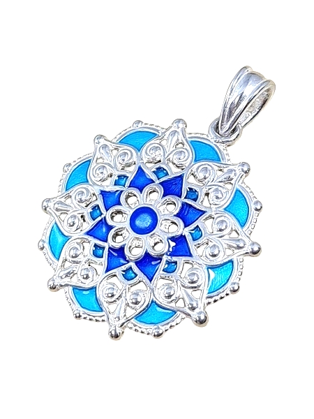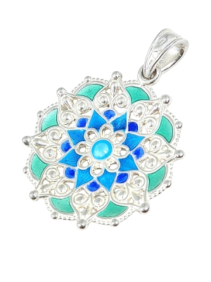 A mandala medált mindkét oldalán díszítettük. A formája enyhén domború. A domború oldalán a kék, a homorú oldalán a zöld és kék szin árnyalataival zománcoztuk, így egyetlen ékszerrel kétféle hangulatot és megjelenést is viselhetsz. Az egyik oldalon mélyebb, intenzívebb színek dominálnak, míg a másikon lágyabb, harmonikus árnyalatok jelennek meg – így kedved szerint váltogathatod őket. Egy medál áráért gyakorlatilag két különböző ékszert kapsz, ami nemcsak praktikus, hanem igazán különleges élményt is nyújt. Ez az egyedi megoldás még személyesebbé és sokoldalúbbá teszi a viselését.