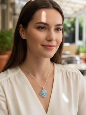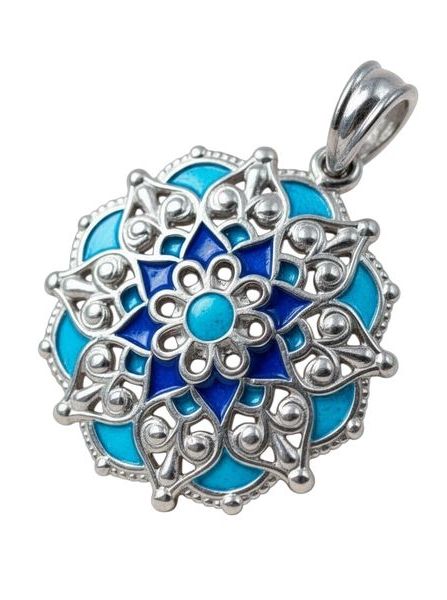A medál központi motívuma finoman kidolgozott, mandala ihletésű geometriai minta, amely aprólékos kézi festéssel, kiváló minőségű, tartós anyagok felhasználásával készült. A különféle kék és zöld árnyalatok – a türkiztől az óceánkéken át a smaragdzöldig – vibráló energiával töltik meg az ékszert. Ezek a színek nemcsak vizuálisan megnyugtatóak, hanem a lélekre is pozitívan hatnak: a kék a nyugalom és tisztaság, míg a zöld a természet, a gyógyulás és a megújulás színe.