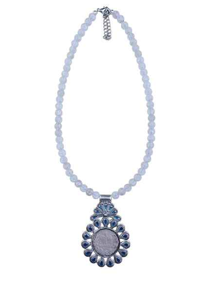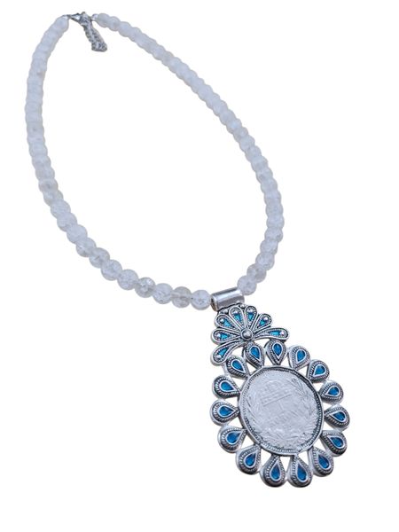 A nyakék a régi lázsiás viseletét eleveníti fel. A lázsiás szó eredetileg egy pénzérme elnevezése volt, melyet a 18. század végén és a 19. század Magyarországon is használtak. Később a pénzérmékből készült nyakék is ezt az elnevezést kapta. Korábban Magyarország több táján is használatban volt, a 19. század végére már csak Szekszárd, Kalocsa, Baja, Szeged vidékén és Bácskában viselték. A 19. században inkább textilszalagra, esetleg színes, akár gyógyító erejűnek tartott gyöngyök közé fűzték az ötvösök által díszes foglalatba helyezett pénzérméket. Ez a lázsiás matt roppantott hegyikristály ásványfüzérrel készült. A fémdísz felülete antikolt, a spiáter alapfém régies hatású szürke színét kiemelendő.