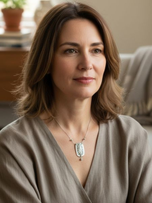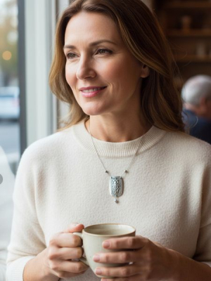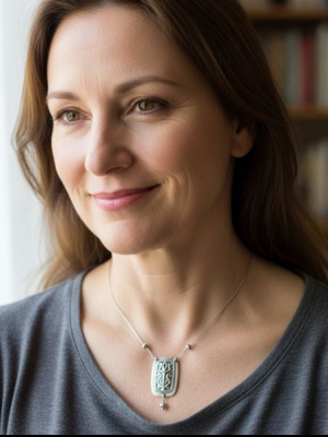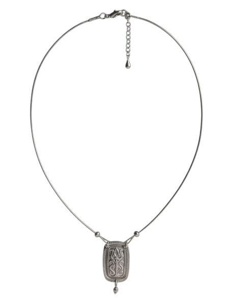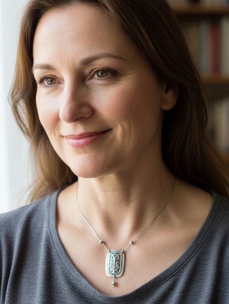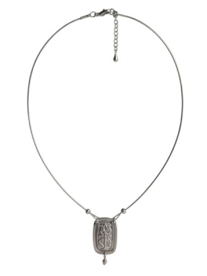 A motívum kialakítását a magyar népművészetben gyakran megjelenő tulipánábrázolás ihlette, ami a nőiséget jelképezi. Az életfa ábrázolásával egybekapcsolt tulipán az újjászületés szimbóluma. A medált rovátkolt fémgyöngy díszíti. A tárgy felületi plasztikáját antikolással tettük karakteresebbé. A díszítmény felszíne a kiemelkedő részeken világosabb szinű, a mélyedésekben sötétszürke.