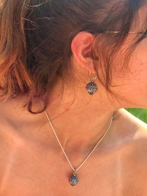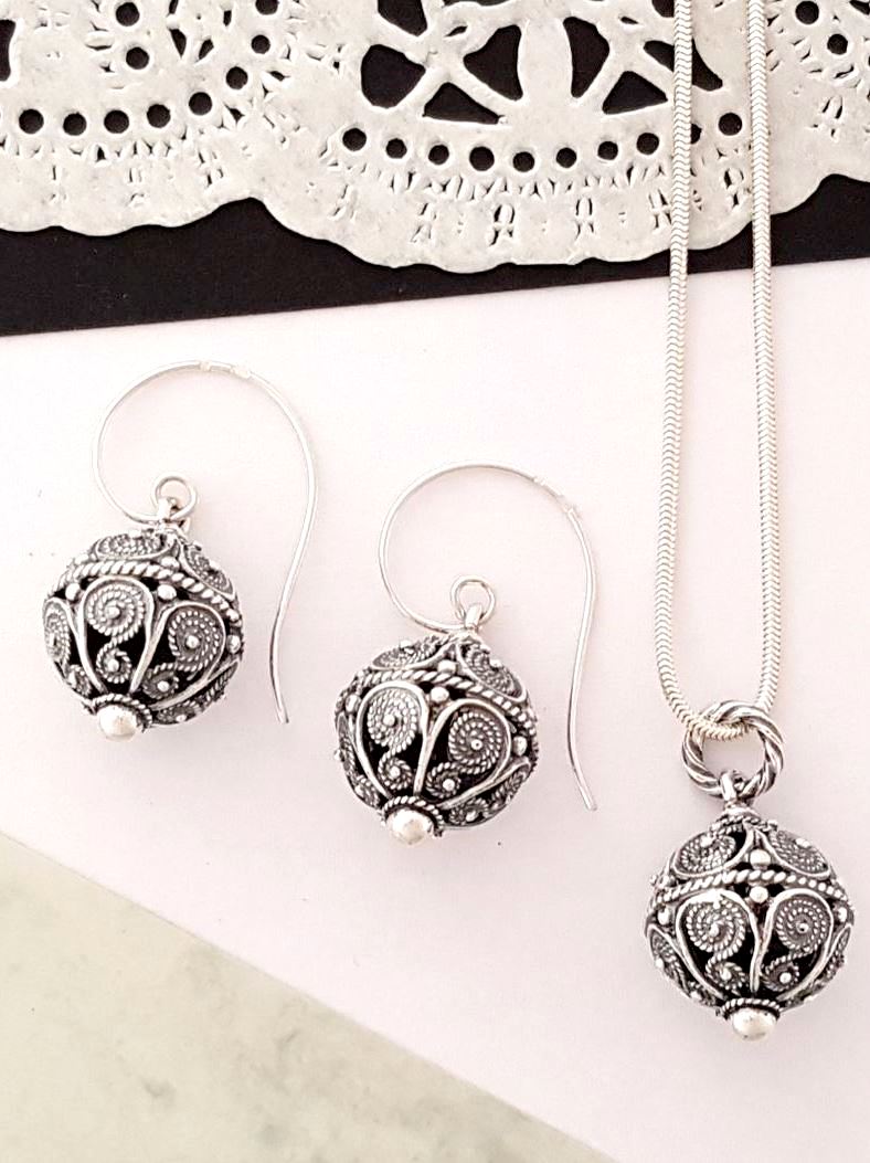 A fülbevaló ötletét az eredetileg gombként használt filigrános pityke adta. Mérete és tömege valamivel nagyobb, mint az általunk készített ezüst fülbevalók többsége. A fülhöz való kapcsolódását spirál alakban hajlított akasztóval oldottuk meg, ami összhangban van a gömb formával.