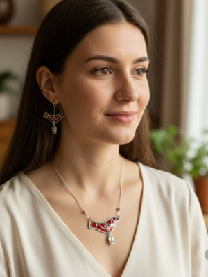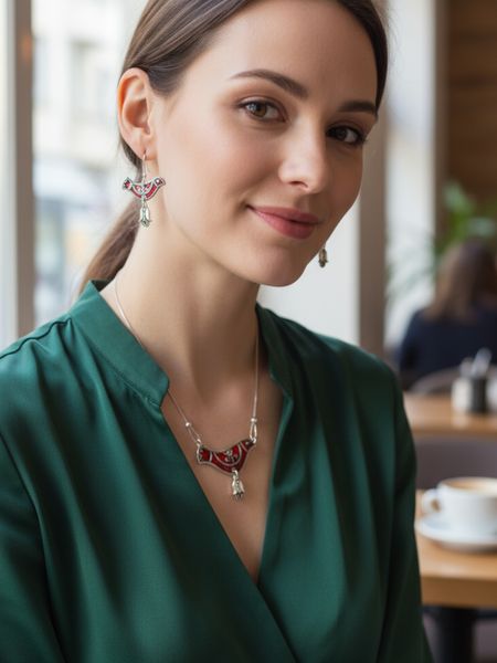 A motívum kialakítását a magyar népművészetben gyakran megjelenő madárábrázolás ihlette, ami az égi szférához kapcsolódó szimbólum, a lelket is jelképezi. Bálint nap a néphagyomány szerint a madarak párválasztásának ideje, így alkalmas Bálint napi ajándékként is. A medált rovátkolt fémgyöngy díszíti. A tárgy felületi plasztikáját antikolással tettük karakteresebbé, a színeket hidegzománccal vittük a felületre. A díszítmény felszíne a kiemelkedő részeken világosabb szinű, a mélyedésekben sötétszürke.