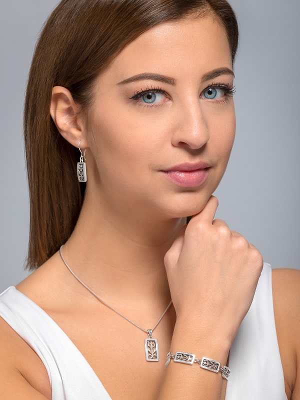 A díszítmény mérete: fülbevaló: 10x17 mm, medál: 12x21 mm. Alapanyaga: ezüst 925.